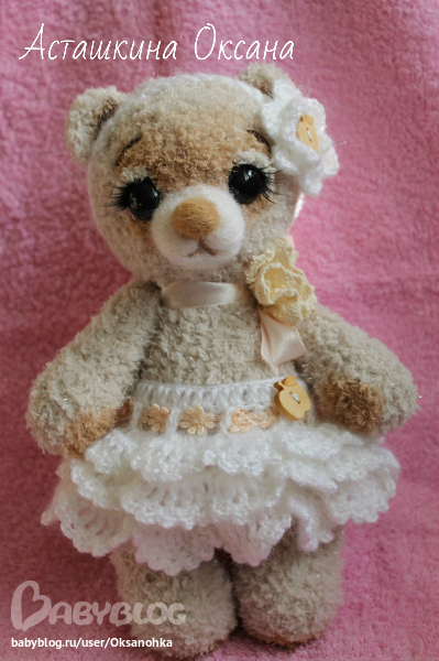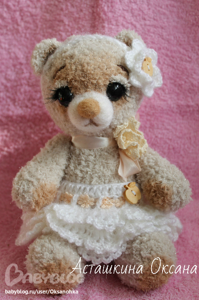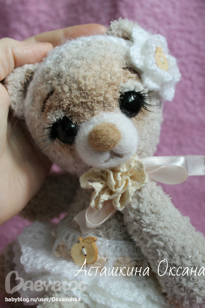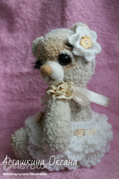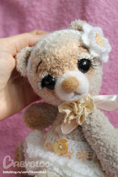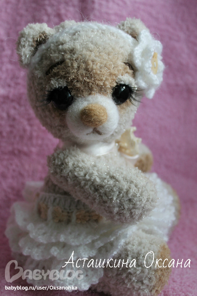 Игрушечный мир - животныеМишка София связана из фактурной пряжи с небольшим мерцанием, (первый раз вязала из этой пряжи, результат понравился, мишка очень приятная на ощупь получилась.) 6шплинтов, набивка - холофайбер, тонирована акриловыми красками для текстиля, цветок и юбочка связаны из мохера, декорированы деревянной пуговкой "яблочко", мордочка и носик - сухое валяние. Ростом мы 22 см.