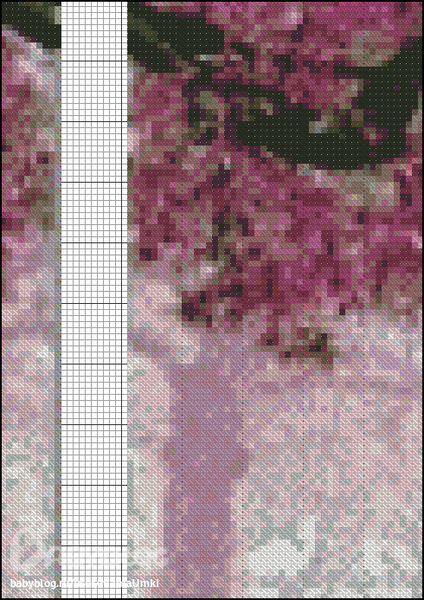) Листва-цветочки четких контуров не имеют, да и ошибка в 1-2 крестика не критична будет (ну, к примеру, если одиночный крестик близким по цвету тоном зашить...). Можно попробовать перенабрать 1-2 листа, результат уже виден будет. Я бы посоветовала 13 и 17 листы - там и цветы, и часть ствола-веток и задний фон (сад в тумане). По ним уже можно будет понять, что из этого выйдет.