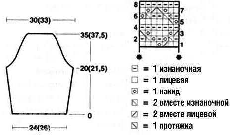 а я уже три раза распускала начатое, но не из-за рисунка... все таки если вязать спицами номер 4 и набирать 86 петель, то получится в результате размер не меньше 50-го)))))))) мой итог - спицы №3 и 67 петель: 63 петли узора, по одной лицевой в начале и конце ряда и две кромочные. Связала до проймы 11 см - это у меня 32 ряда, в каждом восьмом прибавила три раза по одной петле с краев.