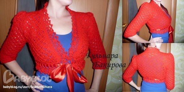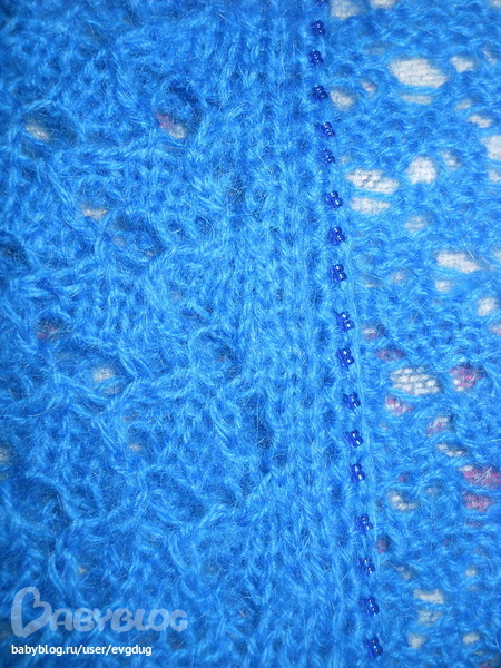 ну, и, как видите, рюшечек нет, вместо них я всё обвязала бисером, ленточка тоже узенькая (не так, как в оригинале), рукава тоже подлиннее малость, но в целом я собой довольна)))