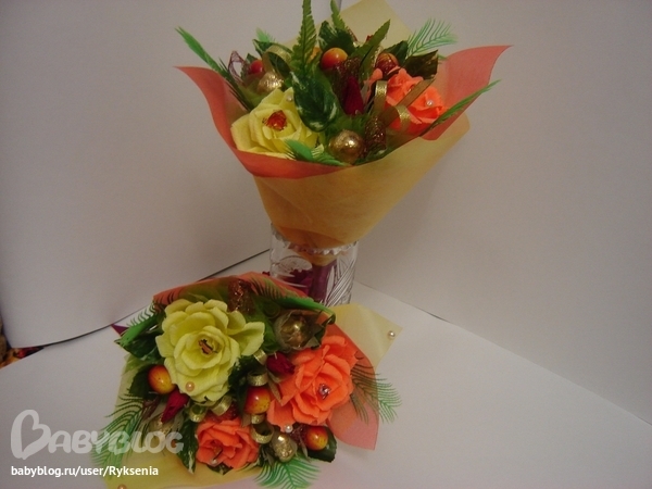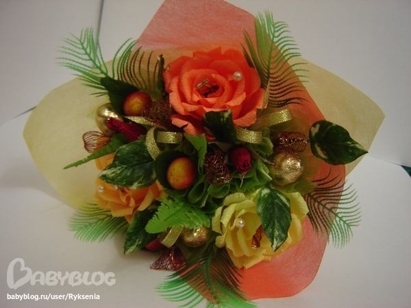 Букеты суперские, а вот упаковка простовата ,на мой взгляд.Попробуй прямоугольники сделать поменьше и добавить их количество.Тогда уголочков будет больше,лягут они равномернее и создадут законченный образ .Я так живые цветы упаковываю, .Кстати лучше всего они получаются из квадратов,сложенных пополам по диагонали и сдвинутых так, чтобы получилось четыре уголка.Место сгиба можно чуть-чуть надрезать перпендикулярно, тогда упаковка хорошо прилегает к ножке букета.