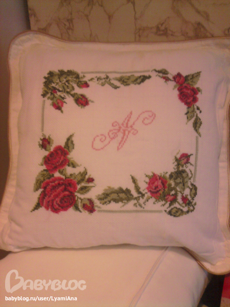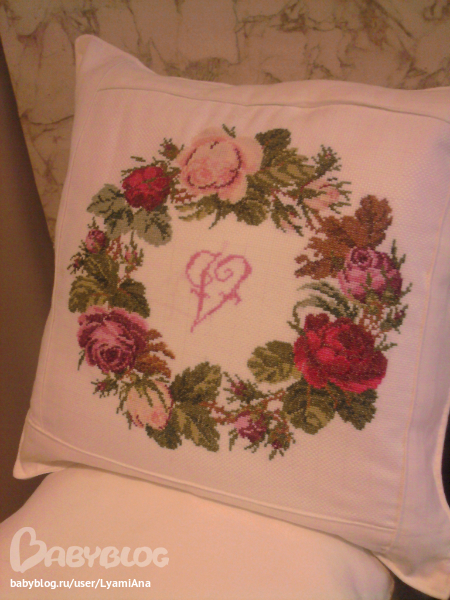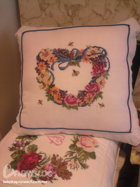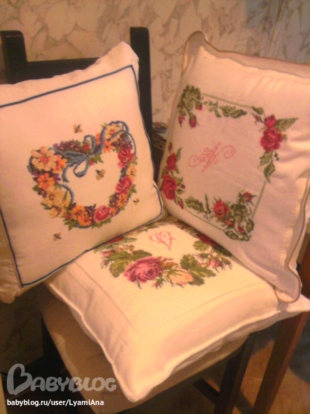 Кроме полезных подарков, приобретенных по интересам и надобностям, был довесок. Подушки для сна, вышивала, собирала, наполняла с огромным удовольтвием и интересом, так как это был первый опыт. Сама восторг испытала от того, что получилось.Тем более вышивалось только две по схеме, а третья - квадратом, была собрана из кусочков схем.