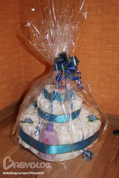 Спасибо большущее!!! Я спросила про памперсы, т.к. есть же пачки с меньшим количеством памперсов. Сама недавно хотела такую красоту сделать, но внутрь положить именно вещички, которые потом вокруг памперсами оформить и ленточкой, наверх пинетки вязаные, а ниже - погремушку, прорезыатель для зубок и т.п. Всё купила, кроме памперсов, а нас сестра мужа пригласила "на смотрины" сразу, как их выписали, и пришлось приданое нашему племяннику в красивом пакетике дарить)))) Так мой торт и несостоялся, но на очереди теперь уже моя родная сестрёнка, так что вопрос о тортиках весьма актуален ;)