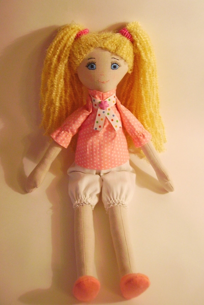 Решила сшить несколько игровых куколок. Первая куколка для девочек постарше, у нее шикарные волосы (вшиты поштучно) для создания разнообразных причесок, ручки на пуговичном креплении. Ручки и ножки сгибаются в коленках. Лицо вышито, одежда из американского хлопка. Съемные только юбочка и туфельки.
