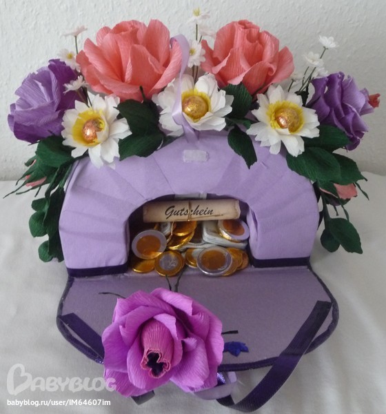 Хорошая сумочка, только меня смущают 4 розы...я понимаю, что они в композиции ...но прям мне в глаза бросаются...не знаю правда куда приходится пятая...отдельно лежащая, но я бы ее в композицию добавила. А второе это когда открываешь сумочку...идея конечно хорошая, но почему кончики ручек видны (((( надо было бы их спрятать под подложку (гофру) . Вот как то так