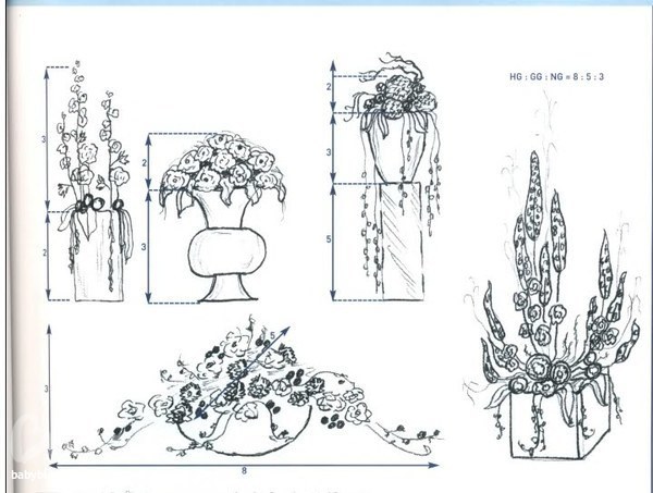 Во флористике применяют чаще всего соотношение 2:3, 3:5:8. Это означает, что, например, при размещении цветов в вазе на высоту вазы должно приходиться три части, на высоту цветов над вазой — пять частей и высота всей композиции составит восемь частей. Примерно так же должны соотноситься части в букете, который держат в руках.