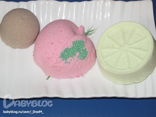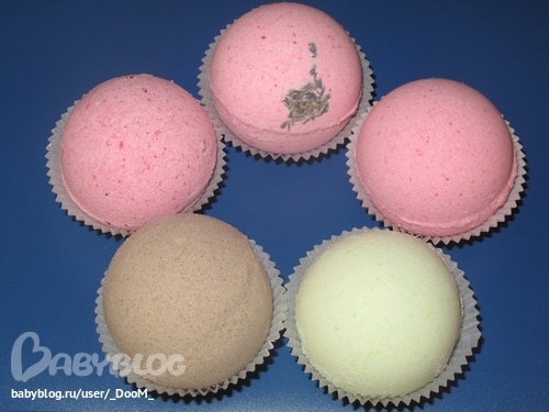 В шоколадных - какао-порошок, отдушка шоколад. В розовых - лепестки роз и отдушка чайная роза. Вроде как зеленоватые пахнут лаймом, а в других розовых отдушка яблоневый сад.