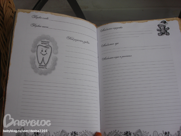 Странички тоже интересные-в начале есть место для записей о ее рождении,любимых играх и игрушках,о прорезывании зубиков,умалках и т.д.Все странички придумывала сама,взяла только нижний рисунок цветов.