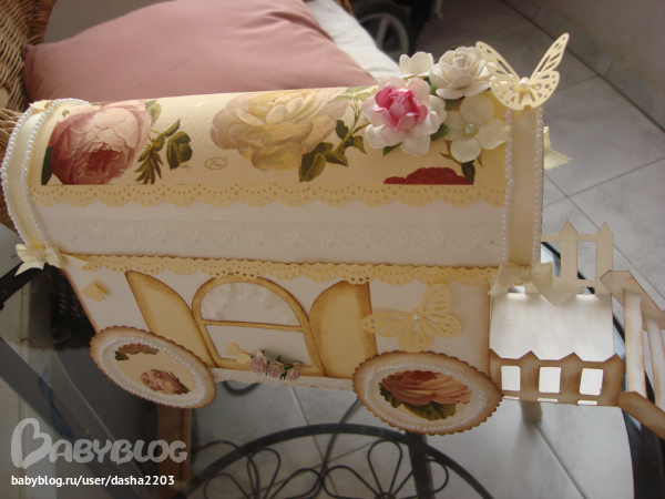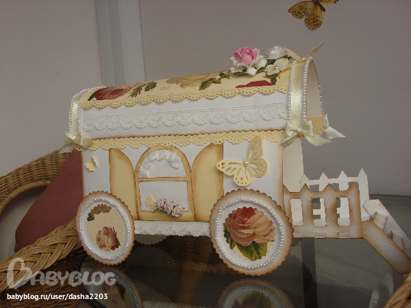 Эта крышка вообще пипец,я с ней намучилась!Картон никак не хотел сгибаться так сильно.В общем если б я делала откидывающуюся-сошла бы с ума))) Но мне и не пришло в голову делать ее откидывающейся-я просто сделала вагончик со "входом" вот туда легко и просто можно вложить поздравление)А мне интересно,кто первоначальный автор этого вагончика?