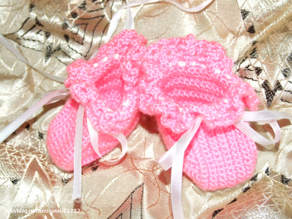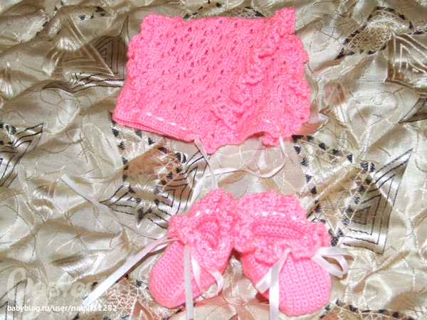 Шапочка и пинеточки крючком. На украшения - цветочки и бусины - ни сил ни времени не хватило.