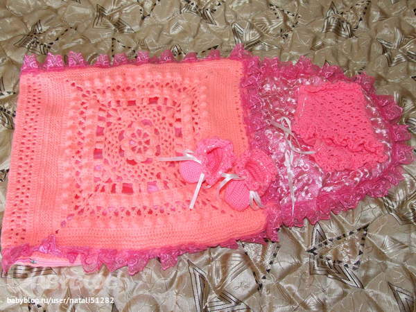 Уже год прошел, но наконец я его сфотографировала. Конверт, шапочка и пинетки для моей дочки.