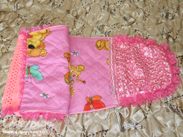 Замки с двух сторон, подкладка - синтепон. Для головы купила гипюр, чтобы не было видно рисунка на синтепоне, пришила с подкладкой из розового шелка.