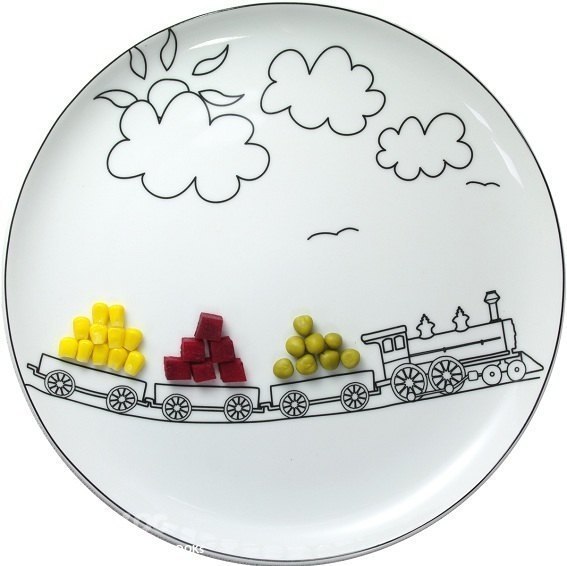 вообще краска по стеклу и керамике, которую чтобы не стиралась нужно потом в духовке подержать. НО!!! вам придется покупать прозрачную тарелку и рисовать с обратной стороны, чтобы краска не контактировала с пищей