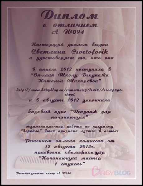 ДекупажЯ получила диплом об окончании онлайн-школы декупажа Натальи Шихаревой http://www.babyblog.ru/community/lenta/decoupageschool ! Радость меня переполняет, порадуйтесь вместе со мной!
