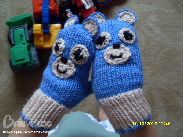 За пару вечеров связала для очаровательного мальчишки Тимошки вот такие варежки. Они идут как дополнение к шапочке, связанной другой мастерицей. Но поскольку имеется только фото с детской мордашкой, выкладывать его без разрешения мамы я не имею права.
