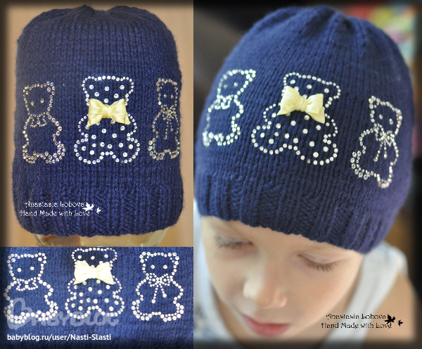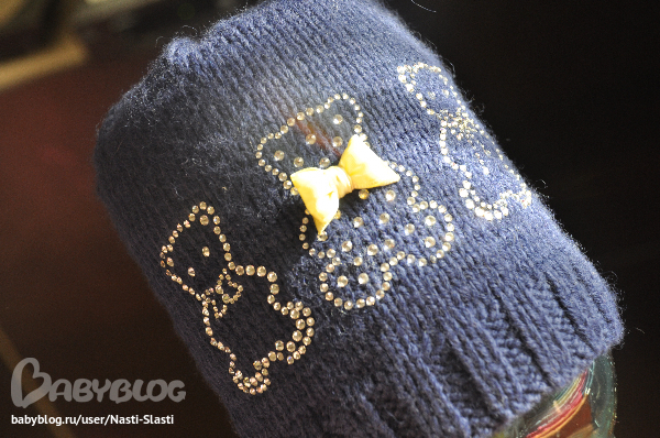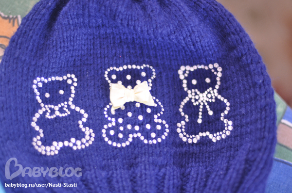 Спасибо! сначала шаблон 1 мишки, на пленку стразы, а потом на шапку. Если вещи не боятся высокой темп. то лучше термо, с ними удобней и побыстрей, а так все-равно, главное чтоб клей подходил