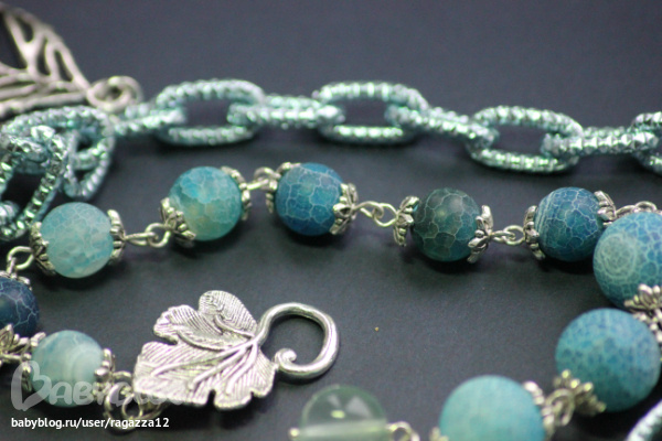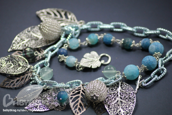 Крупная цепь голубого цвета с насечками блестит и переливается даже в пасмурную погоду,листики (Италия) как будто нарисованы морозом на стекле.Агат "Вены дракона",флюорит и бусинки из бисера тоже подхватывают морозную,зимнюю тему.