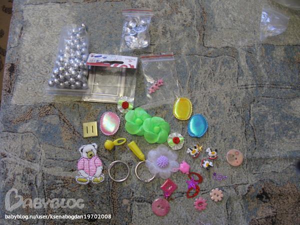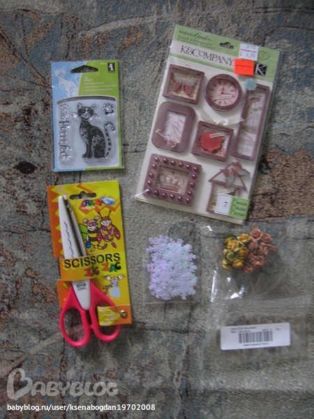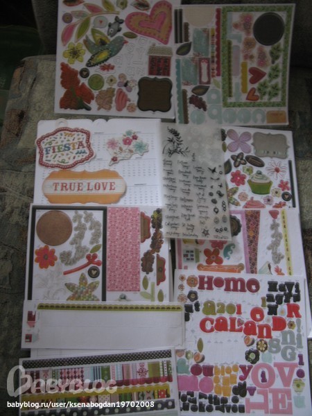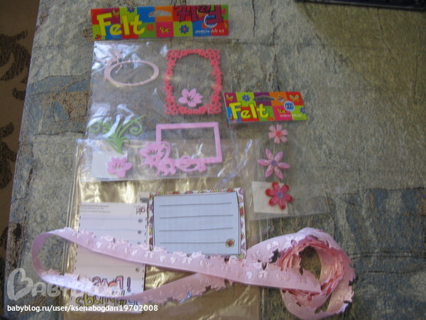 Здесь и наклеечки из фетра(кстати, таких красивых я у нас не видела!), и шикарная лента, и пуговки, и бусики, и много чего интересного...а еще - даже заготовка к альбому!!!!!!!!
