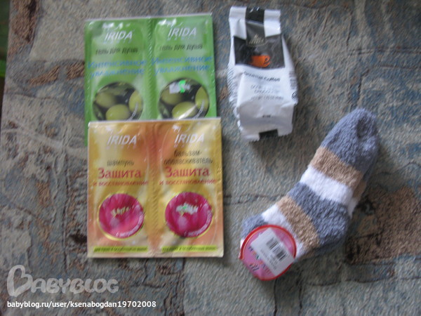 А теперь......подарочки из Екатеринбурга от Иришки (мне гель и бальзамчик, папе-кофе, он его обожает!! А Богданчику-носочки..)