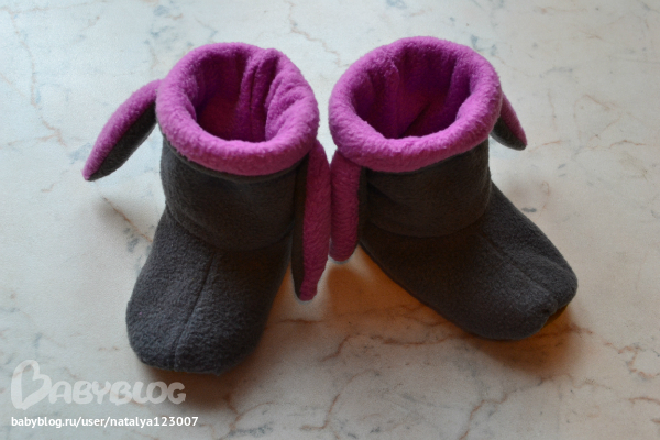 Зайчики получились не удачные - сваливаются с пятки. Попробовала поправить выкройку, и сделать пока без голенища, но пролетела с размером (малы). В самый раз получились только с 3-й попытки, но уже не хватало флиса, так что со швом по середине...