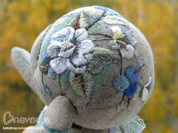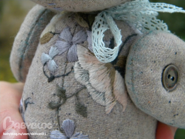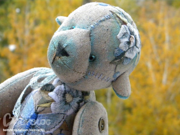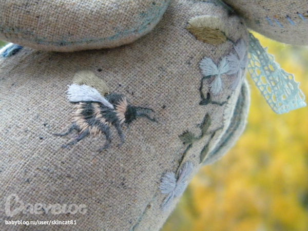 Безумно красивая работа!!! Так интересно вышивка смотрится! И то, что он еще опилками набит-меня прям завораживает)