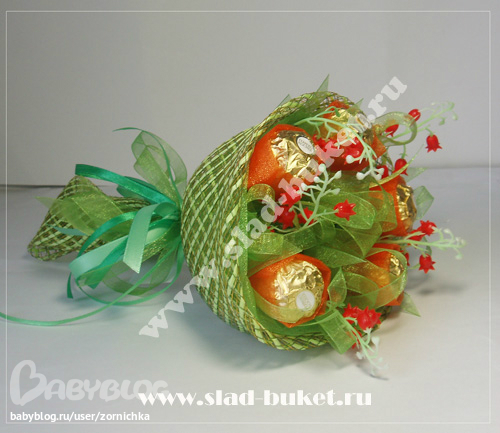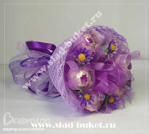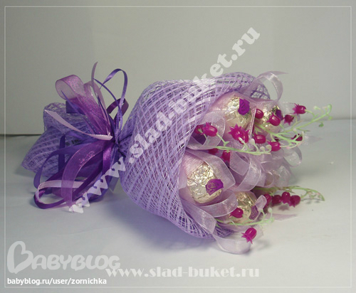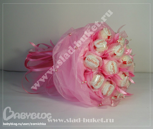 хорошие букетики! а мне с рафаэлками приглянулся, может потому что конфеток по больше и нежненький такой!оля, а как ты рафаэлки крепишь, чтоб названием вверх смотрели, я что то никак догнать не могу)))) подскажи, пожалуйста!!!