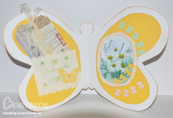 в нутри тоже картинка моя с цветами...тоже нарисована акварелью..еще кармашек с тэгом где можно писать поздравление