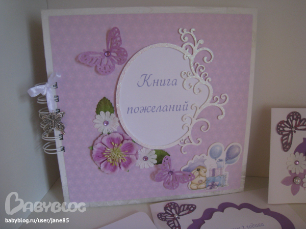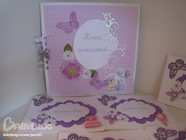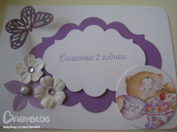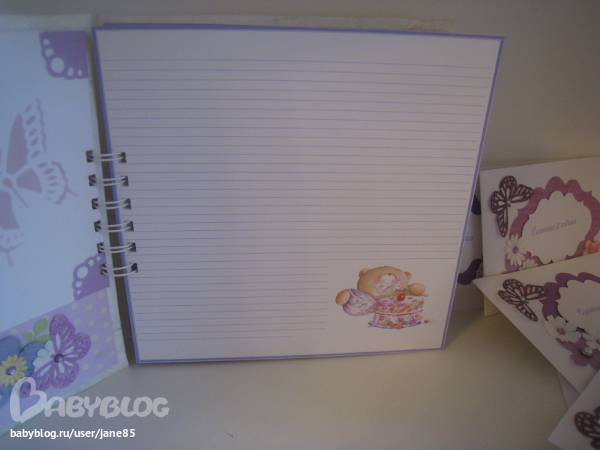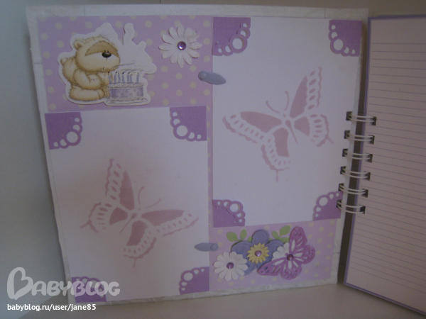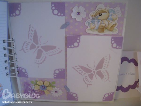 СкрапбукингСделала для ББ Анны (к сожалению не могу встаить ссылку), она попросила сделать в сиреневых тонах с бабочками и цветоками, а я не смогла отказать себе в удовольствии добавить мишек).