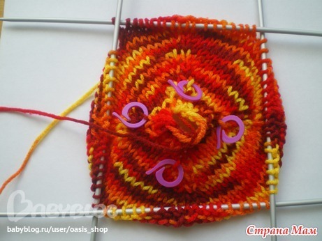 Дальше описывать нечего )) Вяжем и вяжем по кругу, до тех пор, пока количество петель между отмеченными петлями не достигнет 96-ти петель. Вязание в этот период представляет собой квадрат с чётко выраженными диагональными линиями. Вот этой геометрией и нужно воспользоваться.