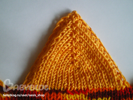 Вяжем лицевой гладью 4 ряда. Далее вяжем по простой схеме. Три последние петли провязываем вместе – первый зубчик готов.