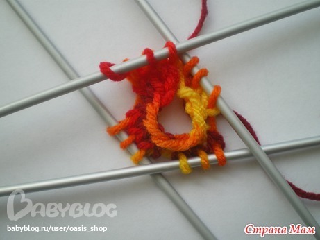 Отметить центральную петлю на каждой спице маркером без замка. Вязать по кругу, прибавляя в каждом втором ряду по 1 петле до петли, отмеченной маркером и после неё. Всего в каждом втором круге будет прибавляться по 8 петель. Таким образом вязать до тех пор, покуда удобно удерживать петли на спицах, потом перевести вязание на круговые спицы.