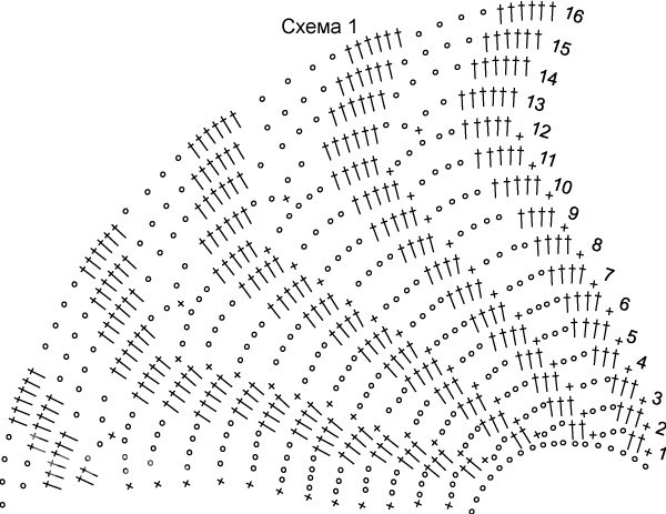 Вам потребуется: 500 г синей (№ 10) пряжи Adelia CANDI (15% шерсти, 85% акрила, 95 м/50 г), Крючок GAMMA № 4. Ажурный узор: вязать по схеме 1 Узор для стойки горловины: вязать по схеме 2 Описание работы На цепочке длиной 50 см вязать по схеме 1, повторяя 20 раз *3 ВП, ст. б/н и 2 ст. с/н*. Сомкнуть вязание в кольцо и вязать по кругу, увеличивая количество ст. с/н и сдвигая их в каждом ряду, как показано на схеме 1. С 13-й ряда сдвигать столбики в другую сторону, а после 16-го ряда разделить круговое полотно, оставив часть полотна по 30 см с двух сторон для рукавов, а перед и спинку соединить в круговое полотно и вязать по кругу, продолжая рисунок (проверьте размер примеркой!). Для приталивания уменьшить количество столбиков в раппорте до 5, а затем после линии талии увеличить опять количество столбиков до 6-и, сдвигая их в другую сторону. Довязав до нужной длины обвязать край «рачьим шагом». Отдельно довязать каждый рукав, продолжая остновной рисунок и расширяя его до 7 ст. с/н в раппорте. Обвязать воротник по схеме 2 на высоту 3-4 см и закончите «рачьим шагом». Нижний край также обвяжите «рачьим шагом».