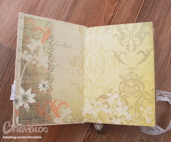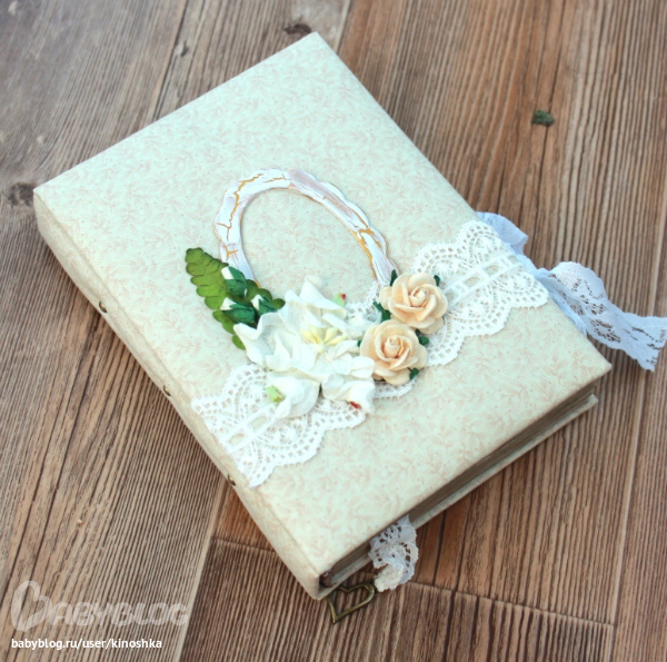 Формат мой любимый - А6, с нуля. Чуть больше 100 тонированных кофе листочков. Закрывается на кружевных завязочках. На закладочке подвеска сердечко. На корешке золотые брадс. Частично проштампован.