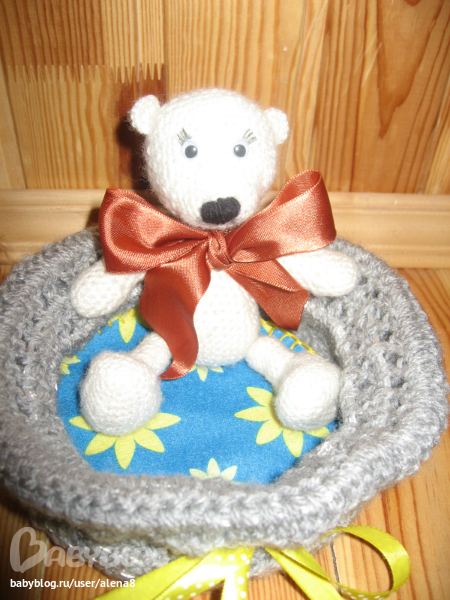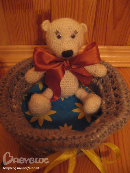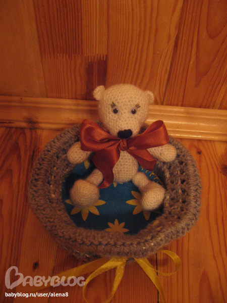 А корзиночка,в которой сидим Мишка-это обвязка бельевой верёвки.Она тоже моя первая корзиночка.
