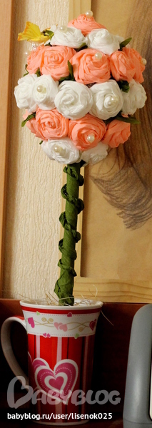 Ой, я у вас в гостях))) в дневнике зачиталась)))) Так интересно) А делала очень просто, палочка, ствол нашла на улице. Шар основу сделала из скотча и бумаги, последний слой из зеленой гофрированной бумаги. Шар посадила на клей на палочку и в цемент, в горшок. Через 15 минут уже сидела с пистолетом, крутила сразу розочки и клеила. Тренировалась долго, часа 2, пока не стали получаться розочки. Причем поняла, что лучше получается, когда скрутила и сразу наклеила. Не знаю, понятно объяснила?))) Я еще 2 недавно для школы делала, вот такой получился