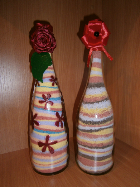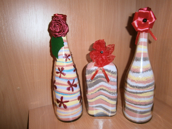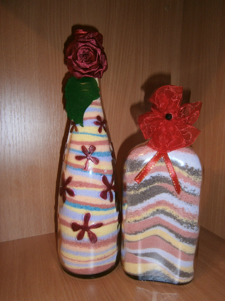Не секрет))) Внутрь бутылки через воронку насыпается соль, покрашеная гуашью, высушеная в духовке и измельчённая на сито. Процесс не быстрый, но результат оправдывает все ожидания)))))