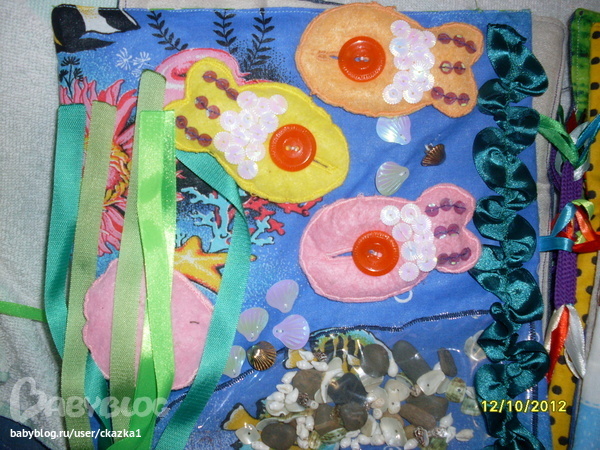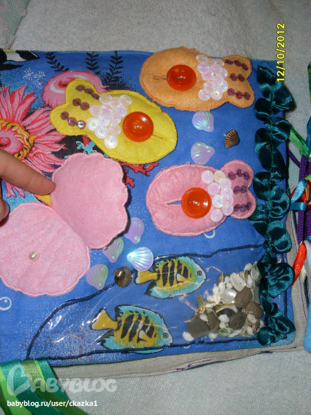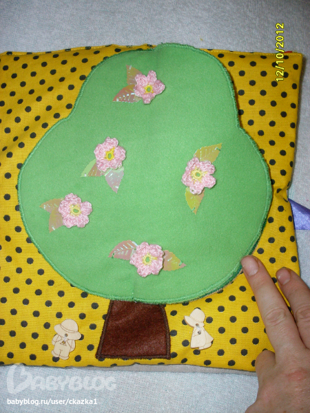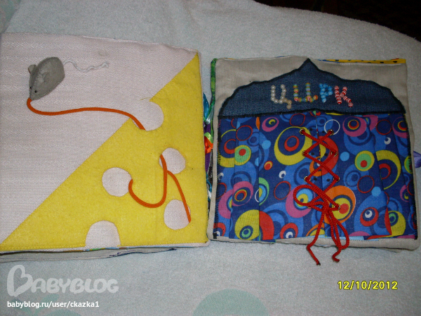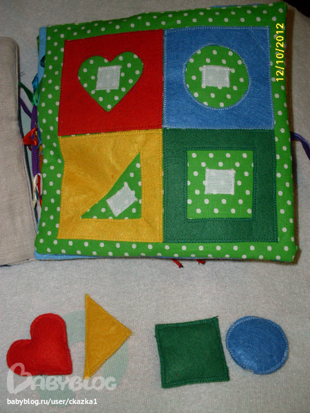 Первый разворот это липучки, пирамидка и формы, сердечко мягкое, в кружочке рис, треугольник шуршит, а в квадрате пуговки.