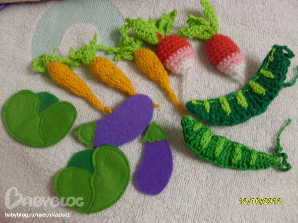 Морковь, редис связаны и набиты синтепухом, горох на кнопках крепится, капуста и баклажан из фетра разной толщины прикрепляются на липучках