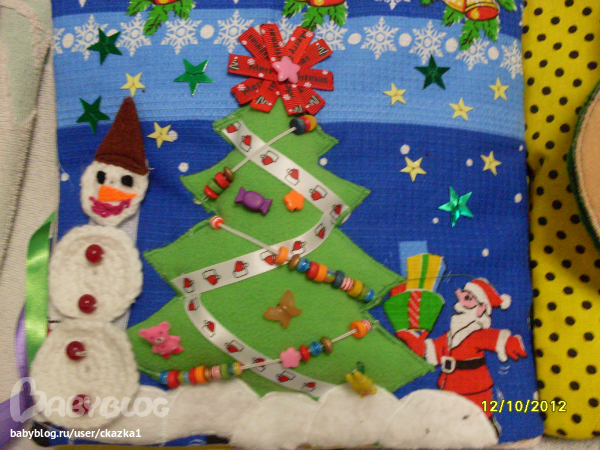 Бусины на елке тянутся на резинке, снеговик немного страшненький на липучках