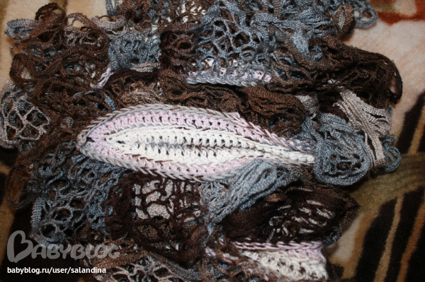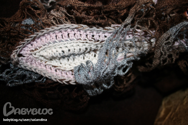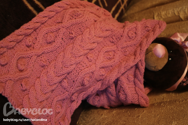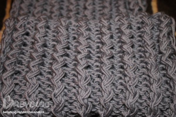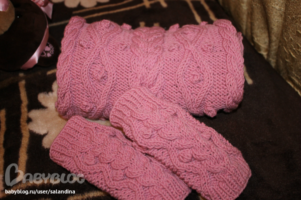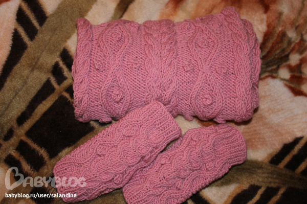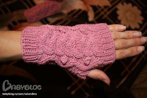 на глаз)))) в середине два жгута 2*2 зеркально отображены, потом шишечки из 5 петель, и аран, вот, потом для пальца оставляла петли, ну и потом сам палец...схем нет, а описывать не умею)))