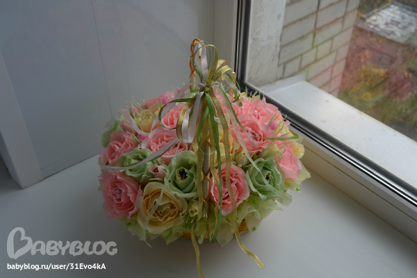 Что сделать с букетом: ты знашь, чт оне учла....Ты все розки очень плотнехонько установила, если б допустила их разлет от краев корзины и вверх, а вниз органзы поболе, было б и пошикарней-пообъемистей и не так бы бумажненько. Ну и бантик...тут уже писали. Во-первых, при бОльшем разлете и свободе цветов тебе бы не понадобилось что то вешать на ручку сверху, а во-вторых...ну ленточки однозначно потолще надо б. Стандарт-2-2,5 см.