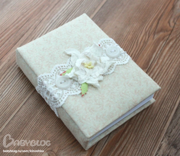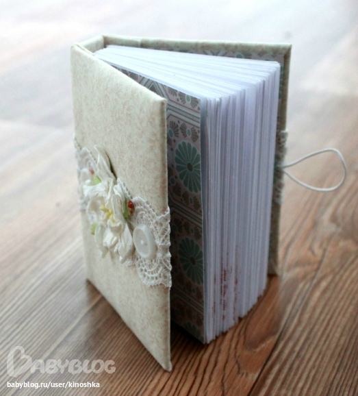 размер маленького - А8, 90 белых листов, частично украшеных штампингом, закрывается на пуговичку шнурочком-петелькой.