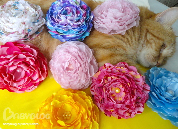 Очень красивые цветы! Выше всех похвал! А солнечный котик как вписывается! :-)Поделитесь,пожалуйста ссылочкой по какому мк их делаете,можно в личку.Дочке хочу ободочек с такой красотой сделать,надеюсь получится :-)