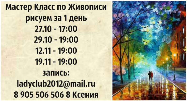 А я был с женой в Москве, на Новослободской 58. Там 5 картин за тренинг нарисовали! Очень понравилось! У вас что-то похожее?