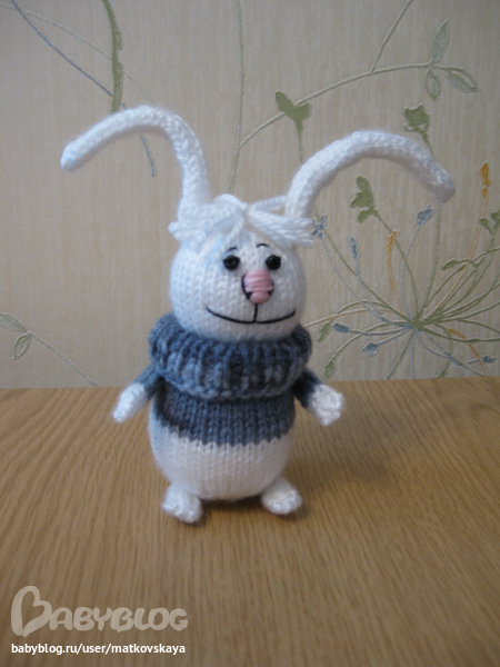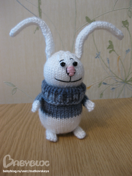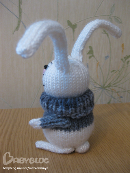 Игрушечный мир - животныеПопросила меня сестричка связать зайчишку. Я начала вязать совсем другого, крючком, но что-то вязание не задалось, голова странная получилась, а перевязывать было неохота, да и время поджимало. Тогда я взялась вязать спицами, на мой взгляд, не очень сложного зайчишку. Описание брала тут. И вот что получилось: