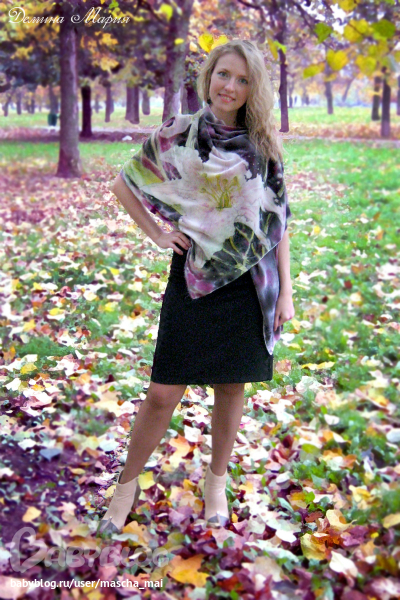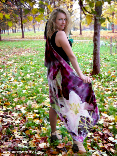 Я с тобой,Маша,тоже с удовольствием бы познакомилась в реальности,думаю это скоро произойдет.Можно на выставки вместе ходить,а то у меня совершенно нет подруг,которые заниммаются батиком и интересуются этим видом творчества.По поводу секретов,так ты знаешь больше,чем я.Я только недавно вновь занялась росписью после 5-летнего перерыва.Был сложный период в жизни и совсем ничего не хотелось делать.Старые работы все почти раздарила ,а новые пока еще в голове.Есть парочка платков в технике шибори,один себе сделала,другой для мамы.Вот нужно их сфотографировать и показать.Шибори на трубе мне тоже очень нравится.А еще хорошо сочетать шибори с классикой,есть парочка идей,как только смогу - буду воплощать в жизнь.