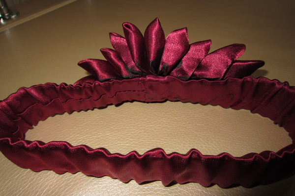 Т.к. это моя самая первая работа, то понятно, что недостатков много. Кривой, косой и т.д. Но я хотела спросить про конкретные. Например, как можно уменьшить толщину (высоту) цветка? Он на 1,5-2 см возвышается на повязке и видно все черные опалины на ткани