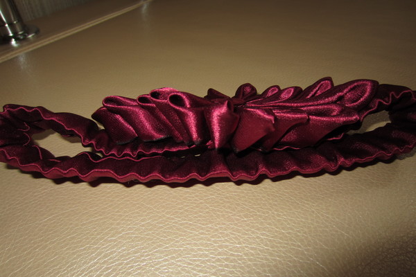 Дорогие мастера цветов канзаши, подскажите, пожалуйста, мне некоторые ньюансы работы. Решила дочке к праздничному платью сделать повязку на голову такого же цвета. Купила креп-атлас точь-в-точь такого же тона. Через полчаса получилось вот: