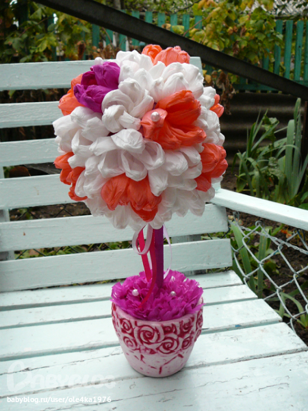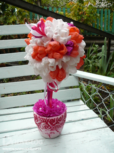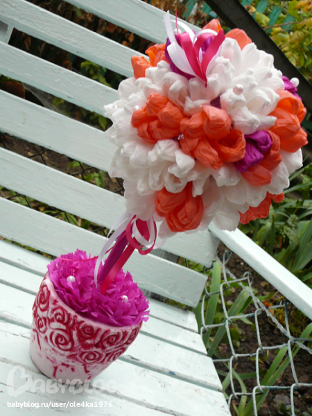Спасибо, ссылки нет, могу просто описать:Взяла обычную салфетку, отрезала с 2-х сторон края и у меня получилось 4 квадратика, если салфетка двухслойная, то квадратиков, соответственно, будет 8. Если двухслойную салфетку не разъединить, то цветочки получаются толстоваты на мой взгляд...Затем разрезаем наши квадратики пополам, т.к. салфетка квадратная, то у нас получаются ровненькие прямоугольнички.Из них делаем лепесточки. 1 прямоугольник - это 1 лепесток. И так, берем прямоугольник, перекручиваем его посередине и складываем его пополам, кончик тоже скручиваем и немного придаем форму лепестка. Лепесток готов )) Соединяем лепестки и перевязываем ниткой или склеиваем клеем.