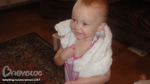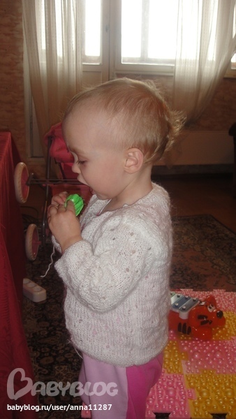после примерки, Лера не отдавала мне кофточку, пыталась надеть на себя, когда мне удало все же ее взять и увлажнить и повешать на вешалку, Лера пыталась из-за всех сил добраться до этой вешалки. пришлось вешать на люстру:)